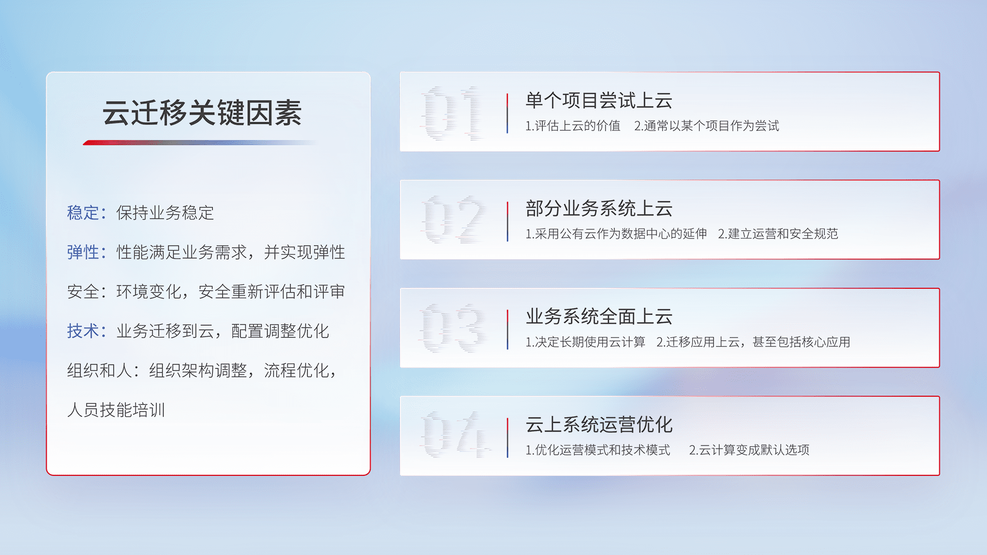 结合实际业务,,,,从规划设计、、云平台选型、、、云原生改造、、、数据迁移、、集成交付,,迁移全过程为客户识别最佳上云路径,,,,做好风险识别管理,,设计网络架构、、身份权限、、安全审计合规、、操作审计、、日志审计、、监控告警策略、、多站点容灾设计等,,,,对云上基础设施进行整体规划,,提升IT治理水平,,以满足弹性、、、、高可用、、、高性能的需求。。